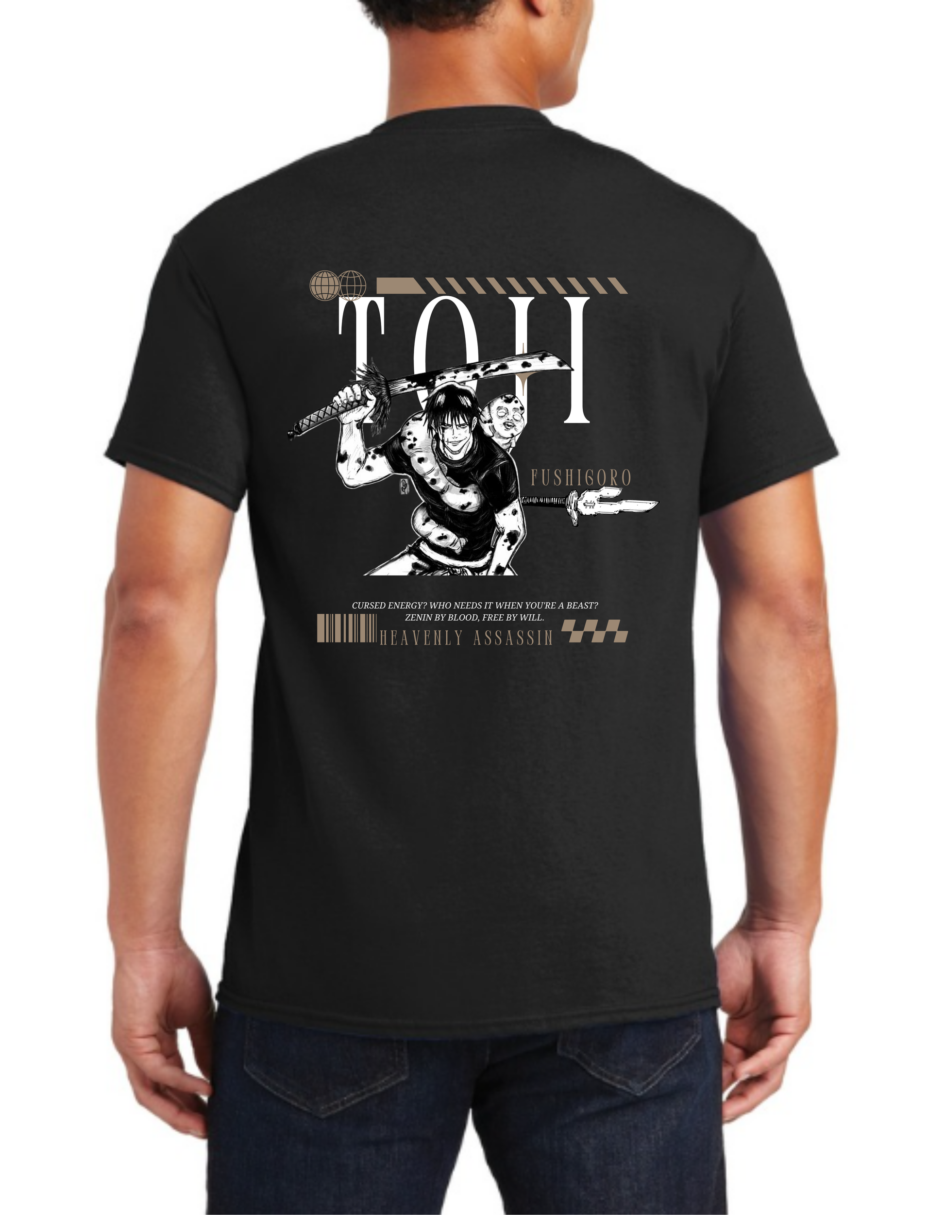 "Unleash the power of the Sorcerer Killer with this Toji Fushiguro t-shirt! Featuring his fierce presence and unmatched strength, this design is perfect for Jujutsu Kaisen fans.